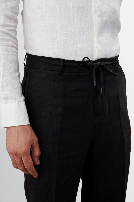 Men's Black Tie Waist High Waist 100% Linen Trousers