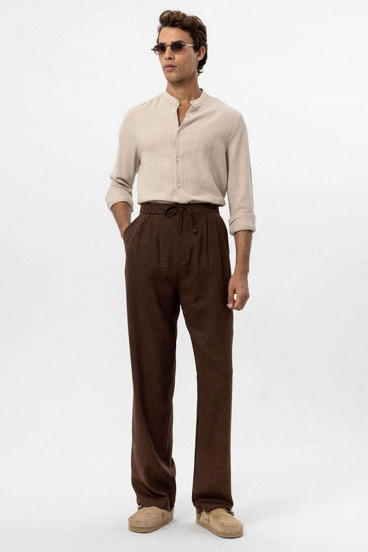 Men's Brown Belted Linen Blend Pants