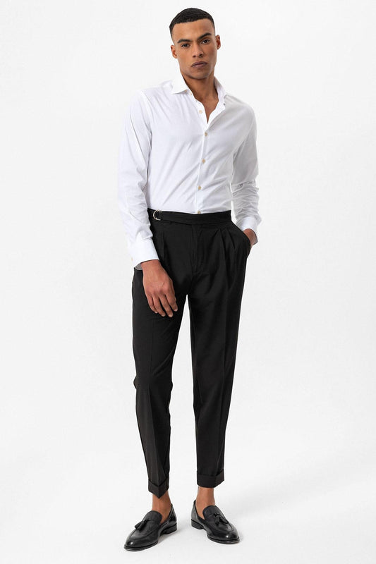 Men's Dark Brown High-Waist Buckle Closure Pleated Pants