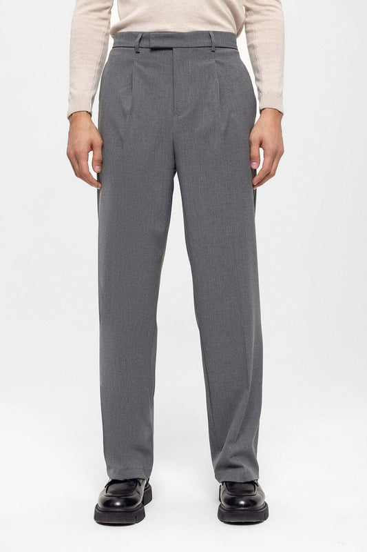 Men's Grey High Waist (Boyfriend) Pleated Fabric Trousers