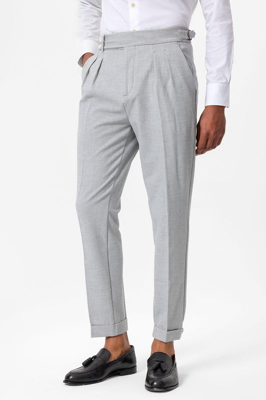 Men's Grey High Waist Side Buckled Pleated Fabric Trousers