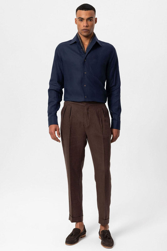 Men's Navy Blue 100% Linen Long-Sleeve Shirt -