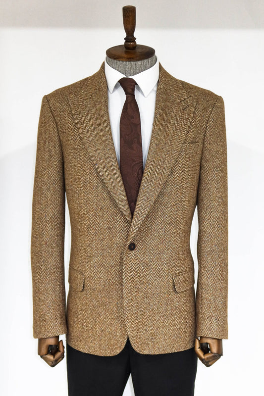 Herringbone Slim Fit Wool Tan Men Blazer and Trousers Combination