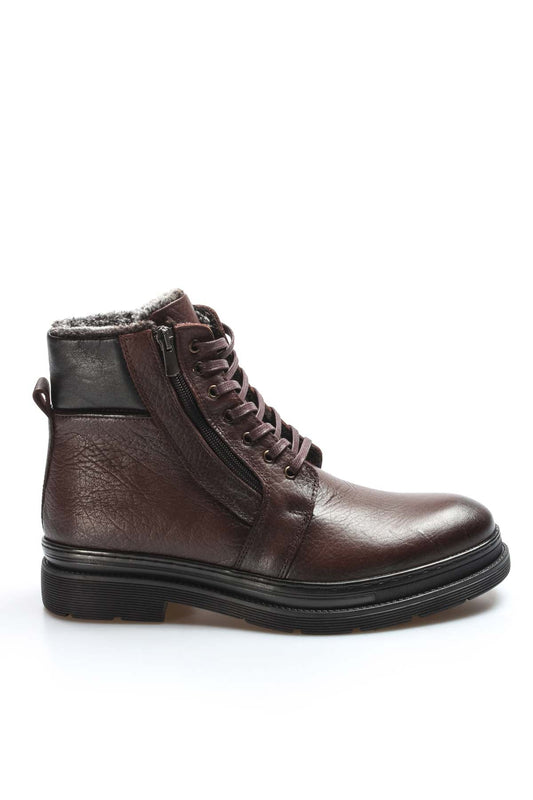 Men's Dark Brown Leather Lace-Up Boots with Side Zipper, Inside Vegan Furry