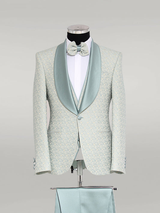 3-Piece Textured Satin Lapel Green Men's Tuxedo with Bow Tie