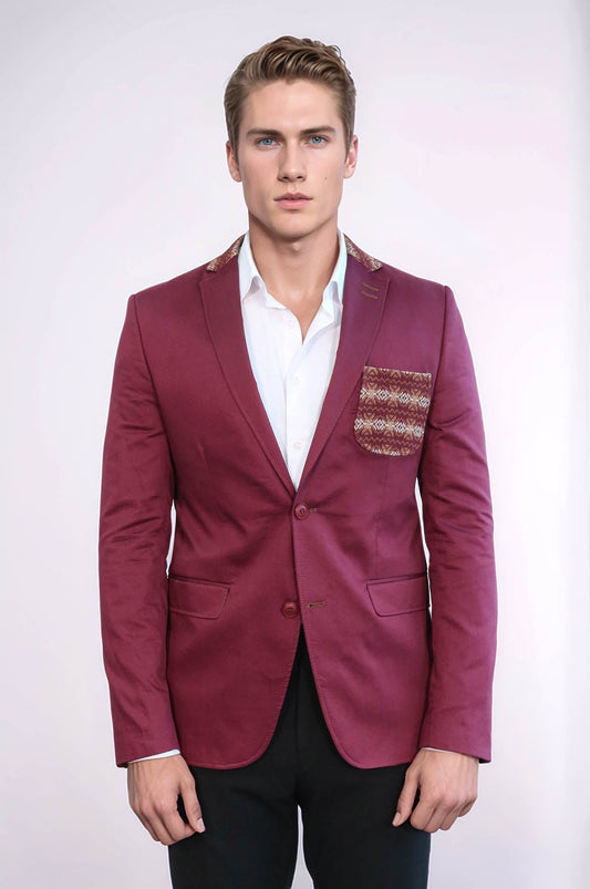 Peak Lapel Slim Fit Gold Patterned Burgundy Men Party Blazer