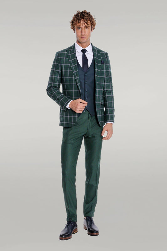Blue Vested Slim Fit Checked Green Men Suit