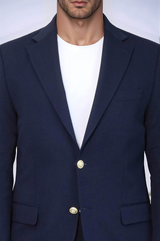 Navy Blue Textured Gold Metal Button Slim Fit Men's Blazer Jacket