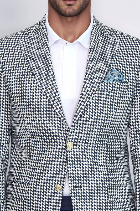 Navy Blue Houndstooth Pattern Gold Metal Button Slim Fit Men's Blazer Jacket