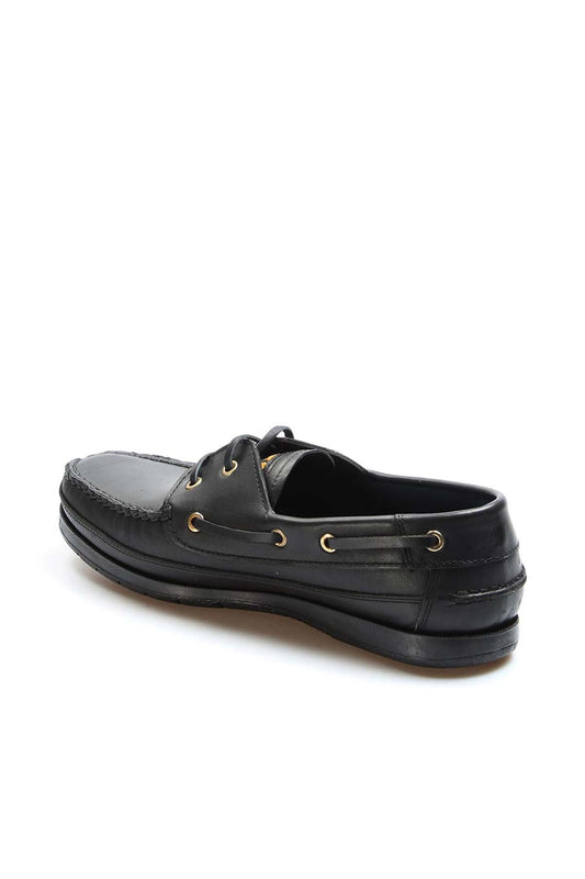 Men's Black Leather Boat Shoes with Lace-Up Detail