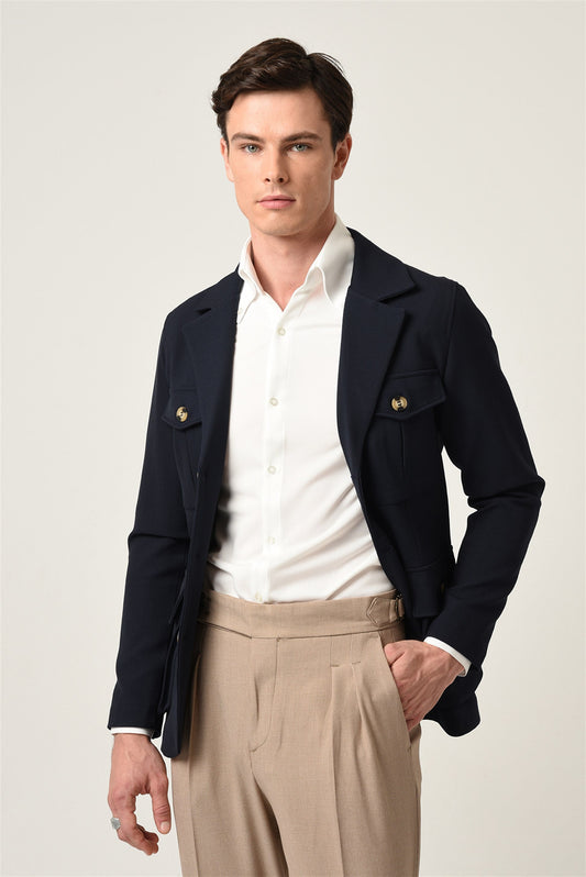 Navy Blue Textured Gold Metal Button Slim Fit Men's Blazer Jacket