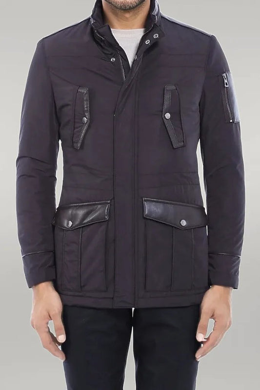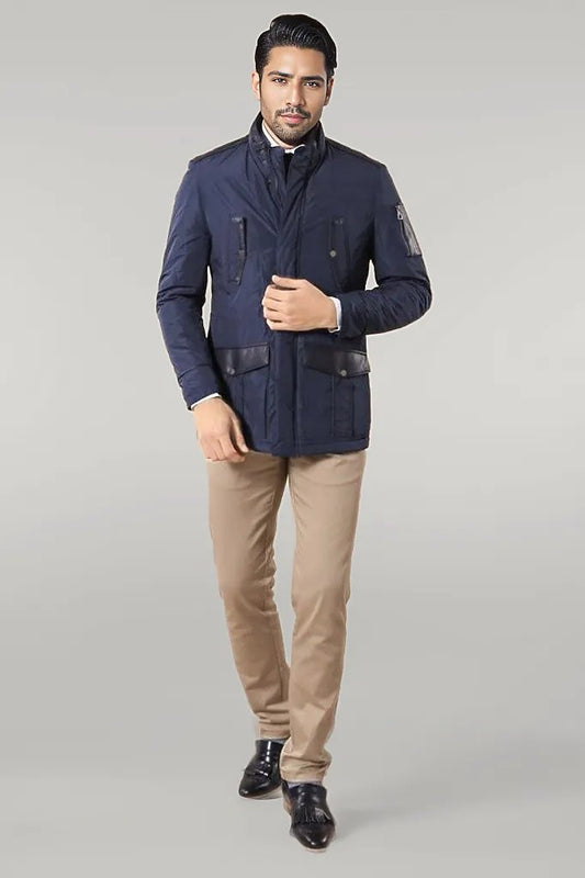 Leather Modeled Navy Blue Slim Fit Quilted Jacket