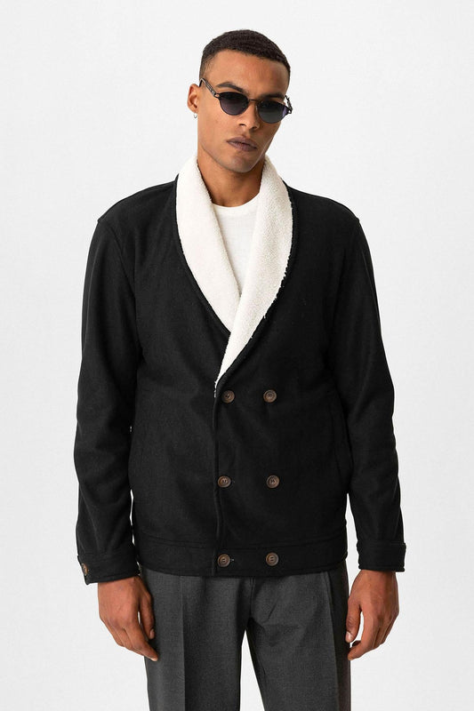 Black Contrast Collar Men's Jacket with Lining Detail