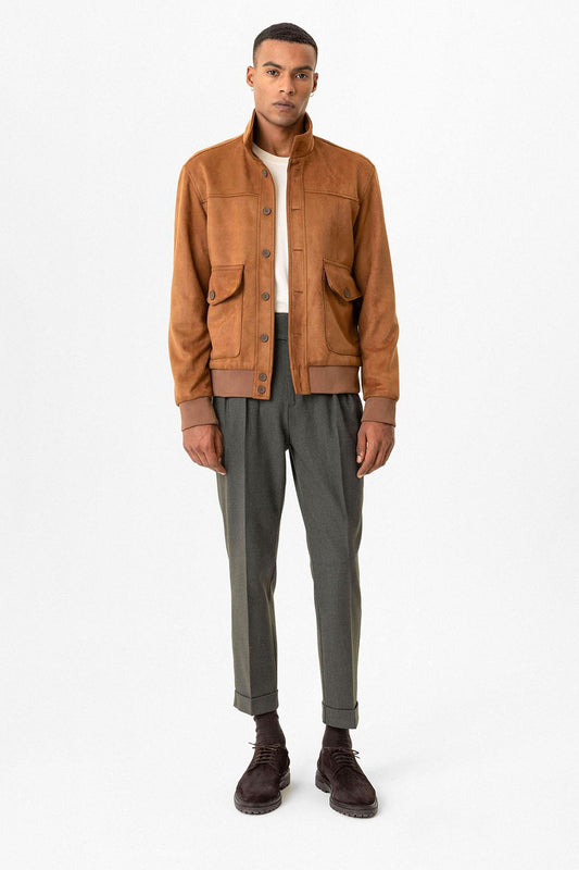 Camel Elastic Waist Stand Collar Suede Men's Jacket