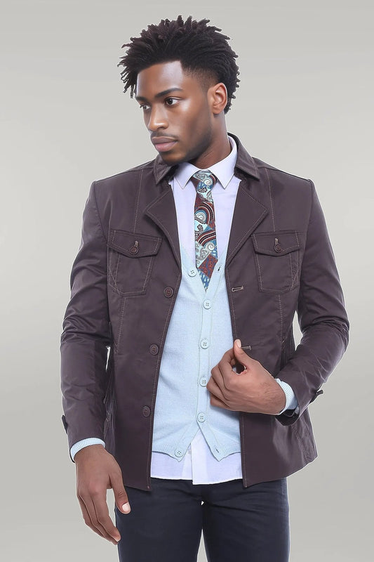 Brown High Collar Men's Coat with Hidden Button Detail
