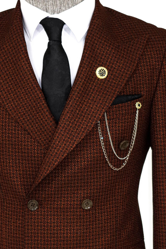 Houndstooth Patterned Brown Men Double Breasted Blazer