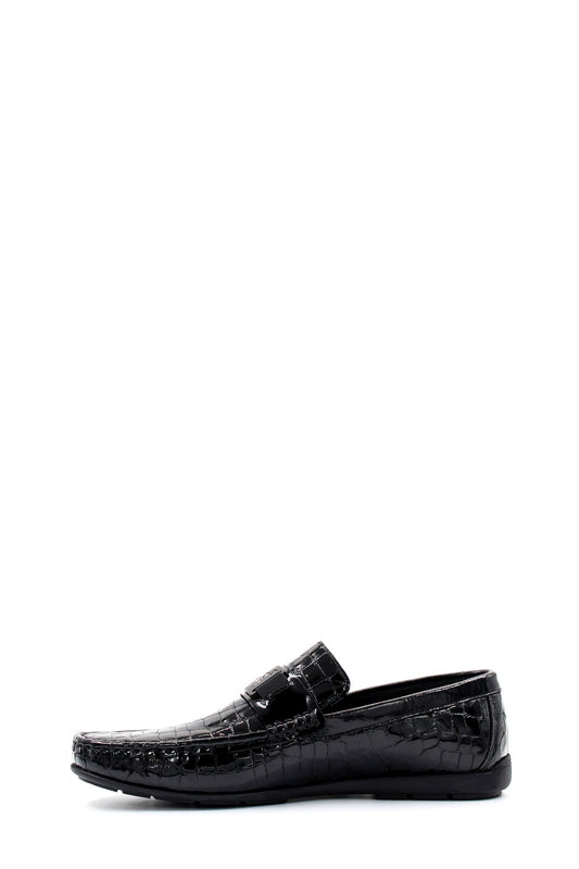 Men's Black Crocodile Patterned Loafers with Glossy Finish