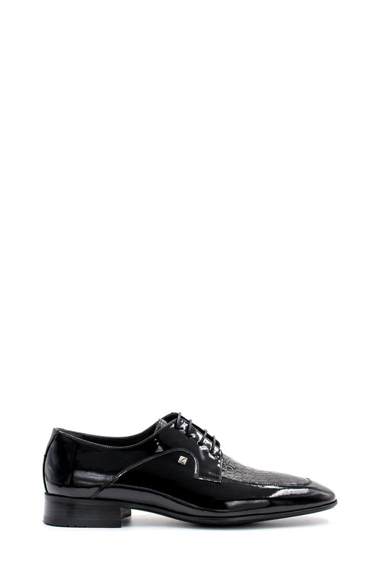 Men's Black Patent Leather Derby Shoes with Croc-Embossed Detailing