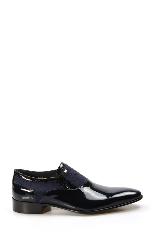 Men's Navy Patent Leather Slip-On Shoes with Quilted Detailing