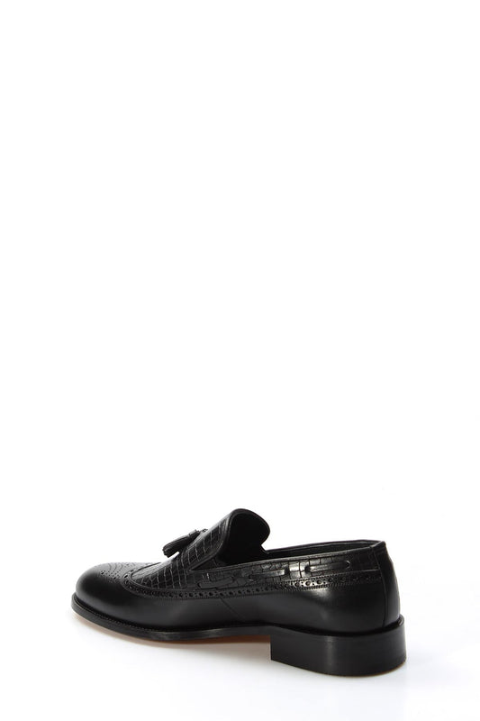 Men's Black Crocodile Embossed Leather Loafers with Tassel Detail and Brogue Accents