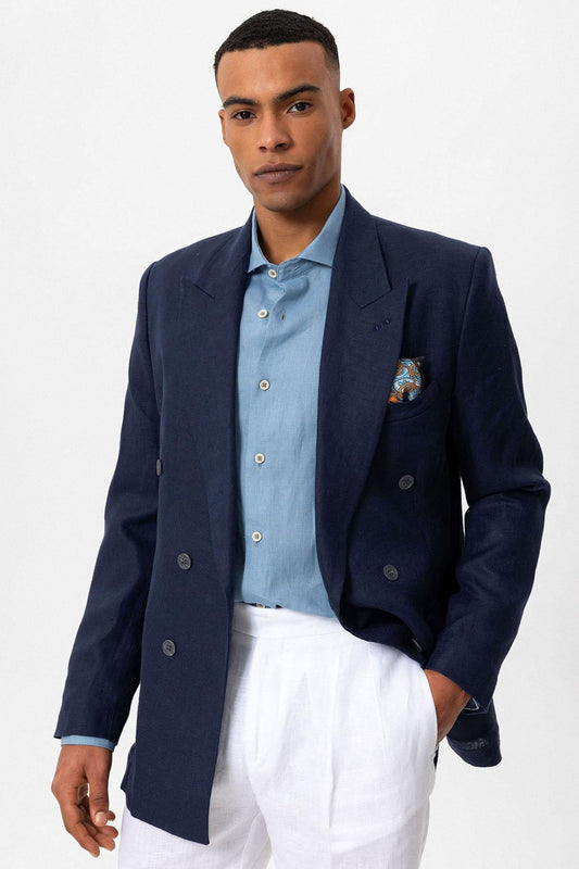 Men's Navy Blue 100% Linen Double-Breasted Blazer