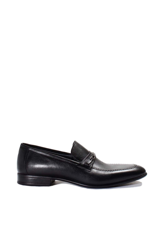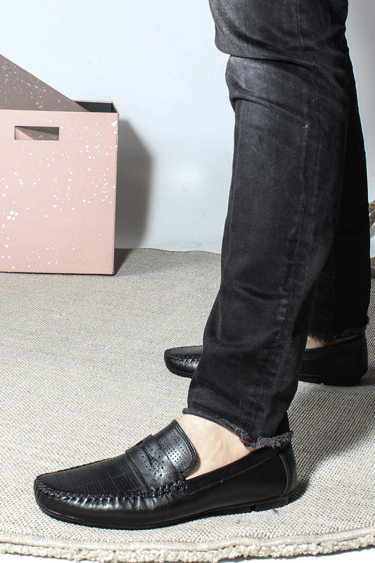 Men's Black Leather Slip-On Formal Loafers with Perforated Design