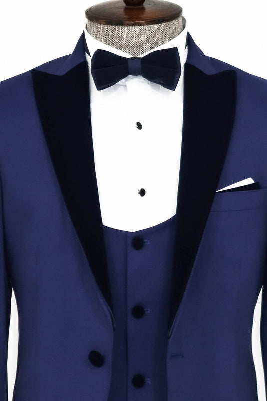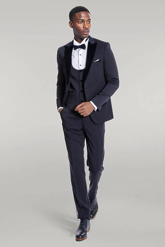 3 Piece Navy Blue Tuxedo with Satin Lapel and Rhinestone Embellishments – Wessi