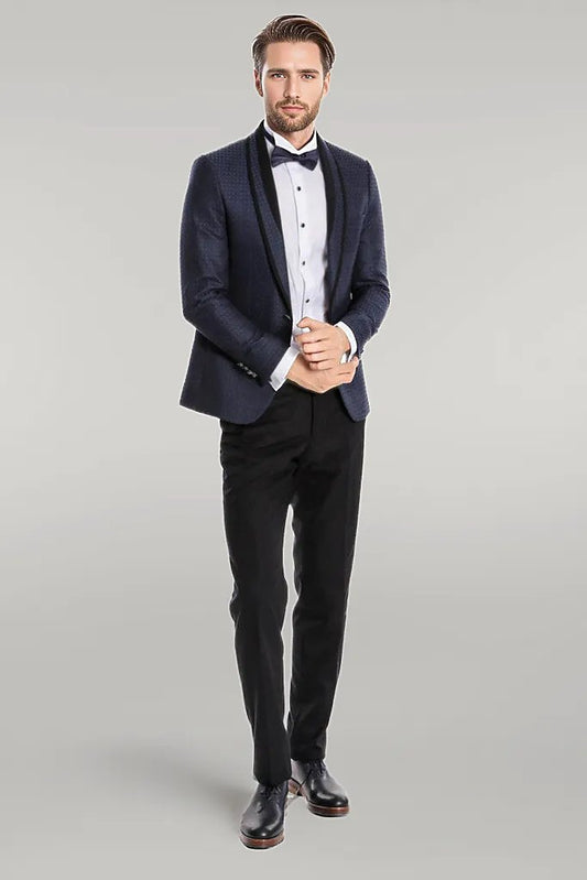 Shawl Lapel Patterned Slim Fit Navy Blue Tuxedo