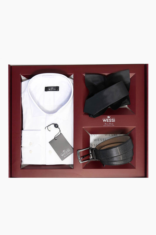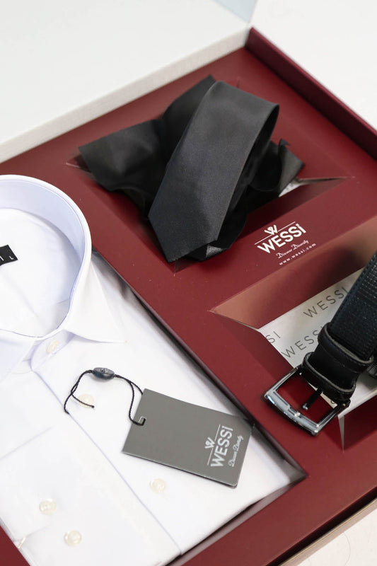 The Dapper Gift Box by Wessi – Includes White Shirt, Black Tie & Black Textured Belt