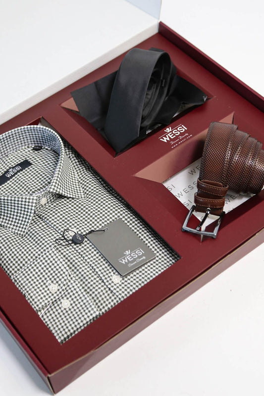 The Dapper Gift Box by Wessi – Includes Green Houndstooth Shirt, Black Tie & Brown Belt