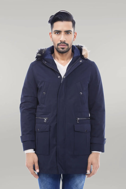 Fur Hooded Navy Blue Men Coat