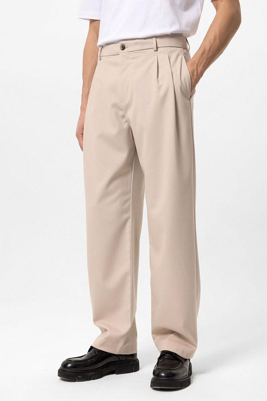 Men's Beige High Waist Pleated Comfortable Fit Trousers