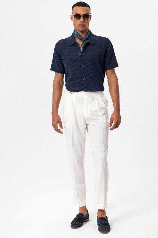 Men's Navy Blue High-Waisted Pleated Buckle Detail Pants