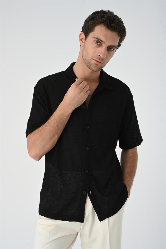 Men's Black Short Sleeve Striped Knitwear Shirt -
