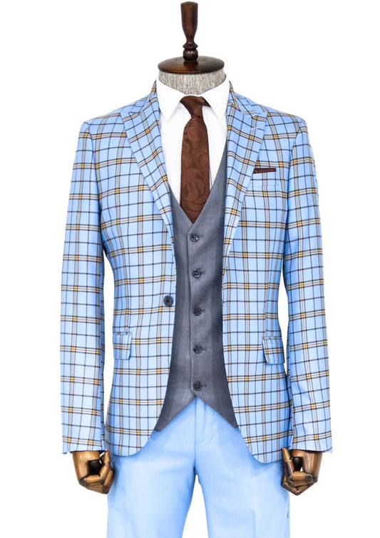 Grey Vested Slim Fit Checked Light Blue Men Suit and Shirt Combination-Regular price $1,273.99Regular priceUnit price / per-