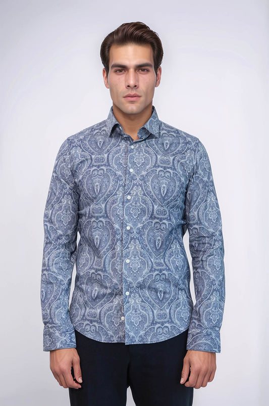 Bloom Patterned Dark Blue Slim Fir Shirt