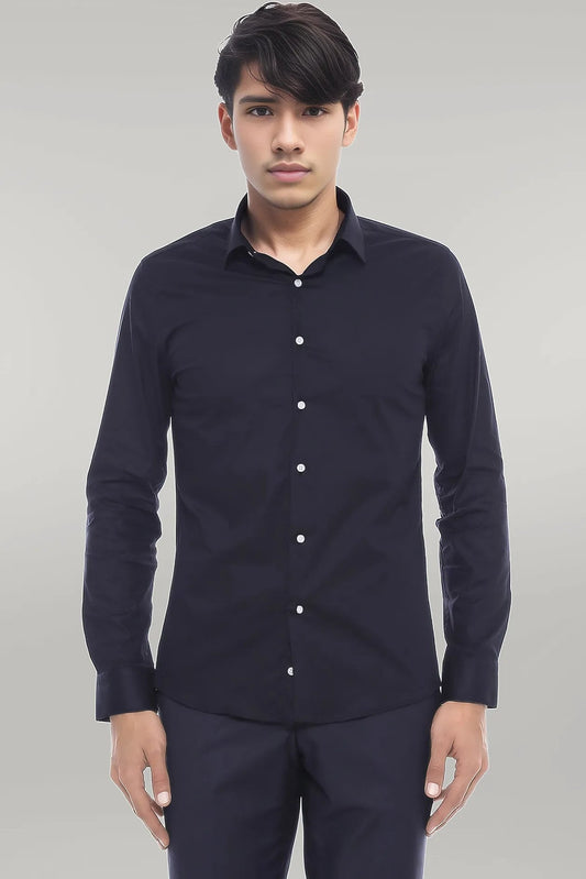 Plain Long Sleeves Regular Fit Navy Blue Men Shirt