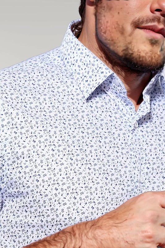 Blue Floral Patterned Short Sleeve White Men Shirt -