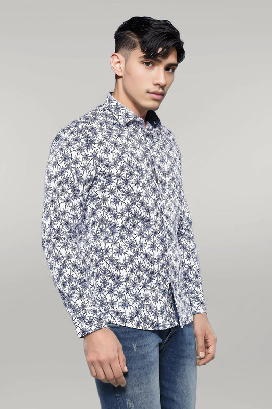 Blue Floral Patterned Long Sleeve White Men Shirt -