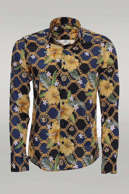 Colorful Floral Patterned Slim Fit Long Sleeves Navy Blue Men Shirt -