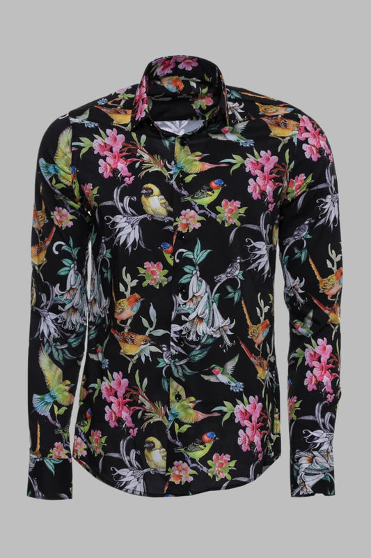 Birds And Flowers Patterned Slim Fit Long Sleeves Black Men Shirt -