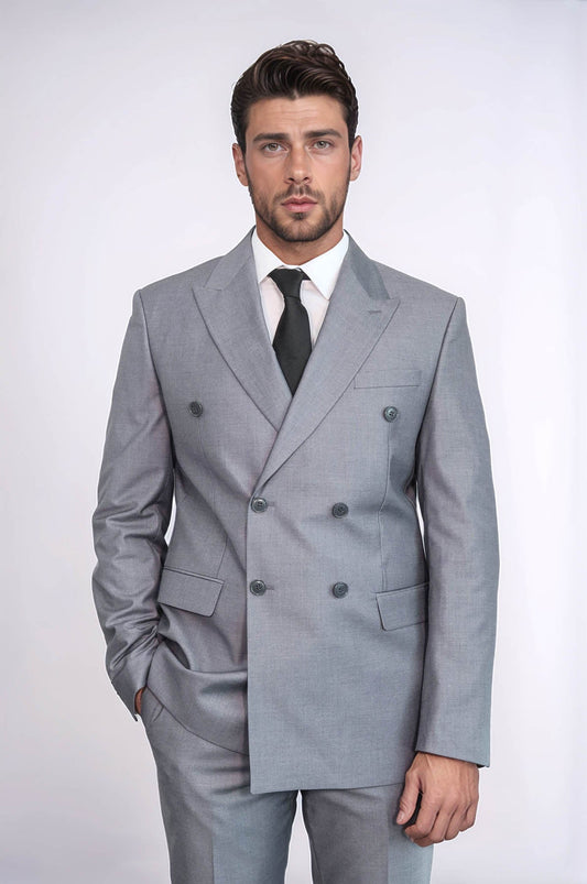 Gray Pinstriped Slim Fit Double-Breasted Blazer with Silver Metal Buttons – Wessi