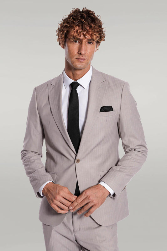 Sand Beige Pinstriped Slim Fit Double-Breasted Blazer with Gold Metal Buttons – Wessi