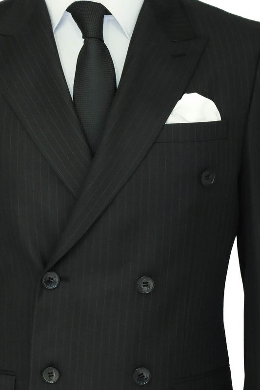 Black Pinstriped Slim Fit Double-Breasted Blazer with Silver Metal Buttons – Wessi