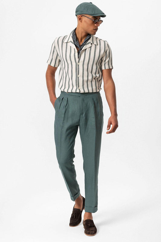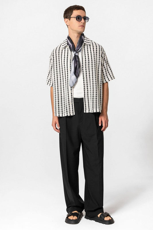 Men's Black Camp Collar Striped Short Sleeve Shirt