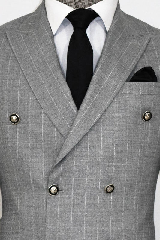 Double Breasted Slim Fit Striped Grey Men Blazer and Trousers Combination