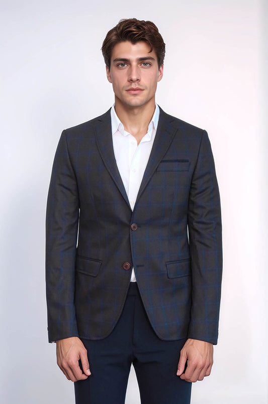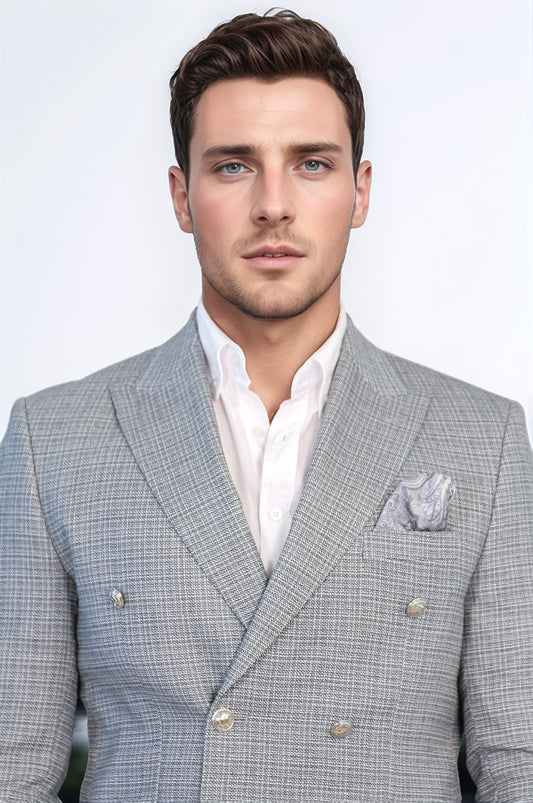 Gray Micro-Check Slim Fit Double-Breasted Blazer with Silver Metal Buttons – Wessi