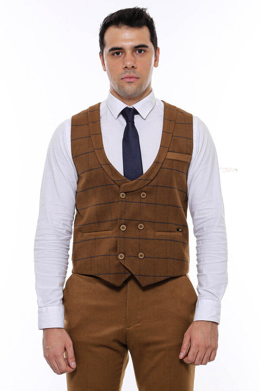 Plaid Double Breasted Collared Navy Blue Men Vest