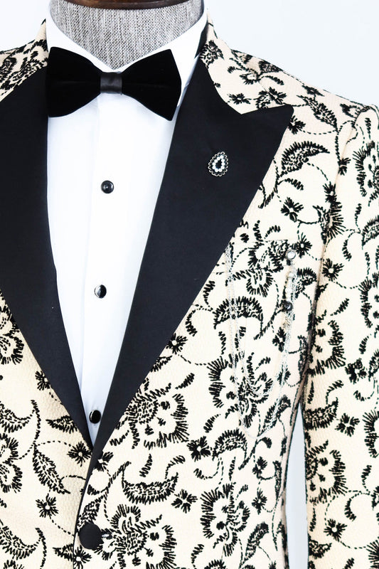 Floral Patterned Peak Lapel Cream Men Wedding Blazer