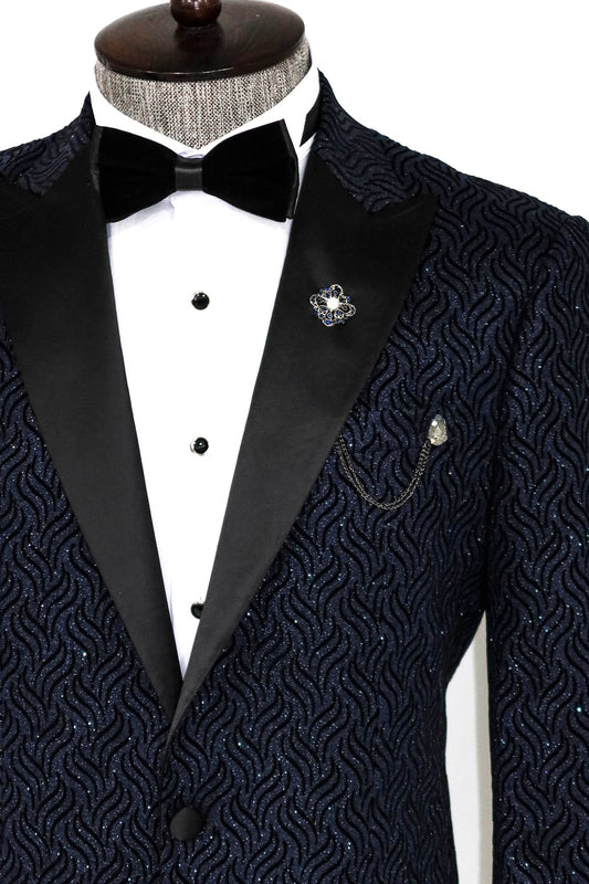 Glitter Floral Patterned Navy Blue Men Wedding Tuxedo Blazer
